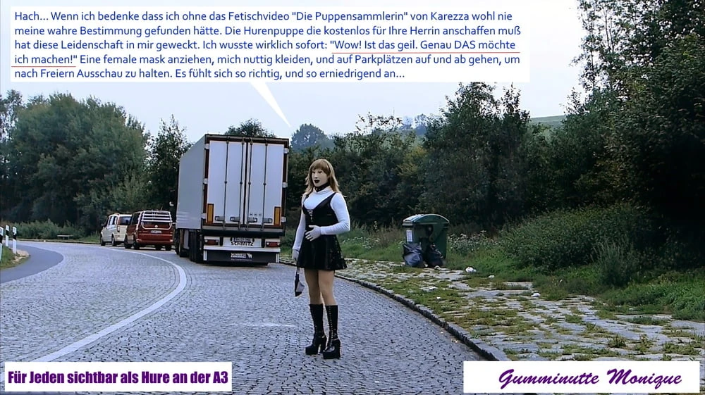 In aufreizender und extrem nuttiger Kleidung zeige ich mich auf Rastplätzen und in Industriegebieten und filme mich dabei. Ich nenne das Sissyhurentraining. Mein langfristiges Ziel ist es meine Hemmungschwelle weiter abzubauen und es als Sissyhure als selbstverständlich anzusehen fremde Schwänze zu blasen. Im Pornokino am gloryhole, als Truckerschlampe und WC-Nutte an der A3 und A73 in der Metropolregion Nürnberg.